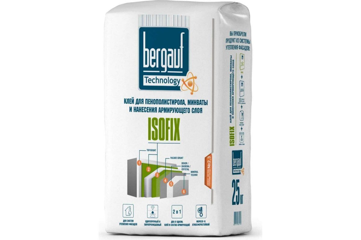 Смесь сухая клеевая для пенополистирола минеральной ваты и нанесения армирующего слоя BERGAUF Isofix 25 кг
